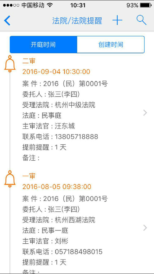 開(kāi)庭提醒:可以自設(shè)置提前幾天提醒,開(kāi)庭2小時(shí)前,系統(tǒng)默認(rèn)再次提醒