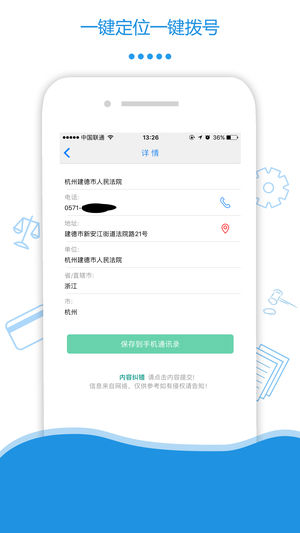 全國(guó)各地司法機(jī)關(guān)電話輕松查詢,一鍵撥號(hào),快速保存到手機(jī)通訊錄,簡(jiǎn)單快速。