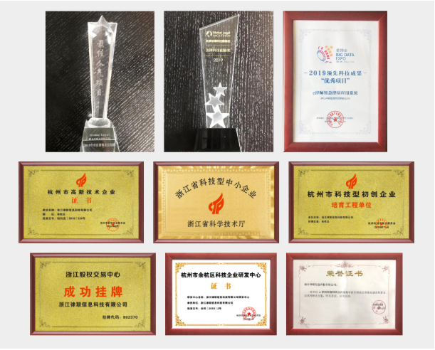 榮獲GLH2019第二屆全球法律科技黑客松大賽武漢賽區(qū)“法律科技創(chuàng)新獎(jiǎng)”和“最佳人氣項(xiàng)目獎(jiǎng)”;榮獲2019中國(guó)國(guó)際大數(shù)據(jù)博覽會(huì)“優(yōu)秀項(xiàng)目”獎(jiǎng)項(xiàng);榮獲2019全國(guó)政法智能化建設(shè)智慧司法優(yōu)秀解決方案獎(jiǎng);軟件著作權(quán)共19項(xiàng)。